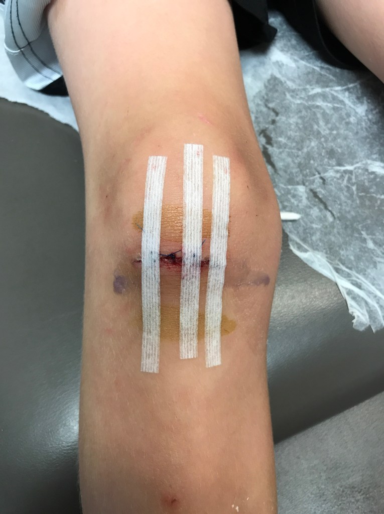 Another family I babysat for was my cousins. They have two boys who are six and eight and a girl who is four. I babysit for them often, but last summer I had a bad experience babysitting with them. Me and the kids were all playing in their playroom which was pretty messy, as usual. We were playing with plastic dinosaurs, helicopters and little toy cars. I was playing with the girl in the corner when I saw something painful happen out of the corner of my eye. The oldest child, John, was running around with a dinosaur in his hand when he tripped on his brothers foot and fell to the ground. He started sobbing quietly, trying to act tough, but by the look on his face I could tell he was in pain. I went up to him to see what was wrong and I was shocked. He pulled his hand away from his knee and there was a very deep cut that was bleeding. He had fallen on the edge of a toy helicopter, which had completely sliced his knee open. I quickly grabbed a towel and put pressure on his knee until his mom came home to take him to the hospital. He ended up getting stitches and glue (shown below) which has since been completely healed.