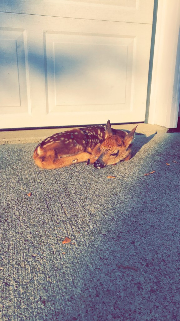 I did not want to hurt or scare the fawn away, but I knew I had to get it to move before I could move my car. First, I took a picture of it because I thought it was cute and I knew I would never get an opportunity to get close to one again. Then, I tried getting closer to it so it would get up and move. Nothing was working but I realized it was probably scared of me, so I walked back into my garage and waited a few minutes. When I came back out, it had left and I could not see it anywhere.